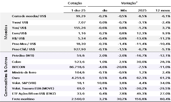 Na Ásia, os mercados abriram dezembro mistos após a divulgação de novos dados de atividade industrial da China. O Hang Seng avançou 0,81%, o CSI 300 subiu 1,10% e o Nikkei 225 recuou 1,89%. Na Europa, as ações iniciam o mês em queda, com o STOXX 600 recuando 0,30%. Nos EUA, os futuros de ações operam praticamente estáveis nas negociações iniciais.