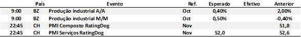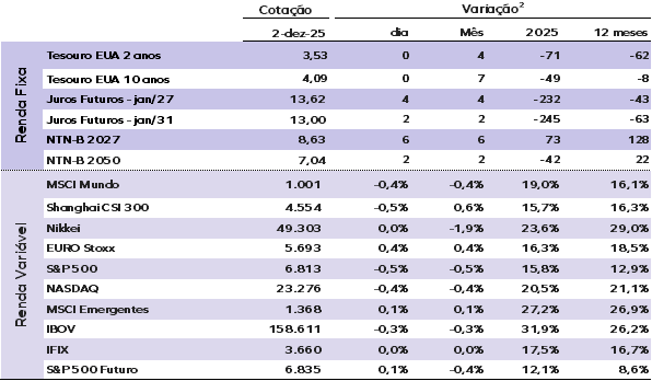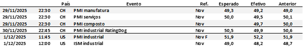 EUA: A atividade industrial perdeu força em novembro: o índice ISM da indústria recuou para 48,2 pontos e contrariou as expectativas de leve alta. Os dados mostraram um quadro misto, mas predominantemente fraco: novos pedidos e emprego caíram, enquanto a produção reagiu modestamente. Indicadores de cadeias de suprimentos sugeriram entregas mais rápidas, embora o prazo médio para obtenção de materiais tenha voltado a se alongar. Pressões tarifárias continuaram a pesar sobre o setor, com empresas citando custos mais altos e crescente incerteza global.