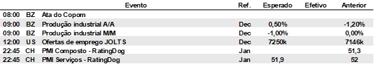 EUA: O índice ISM da indústria subiu 4,7 pontos em janeiro, para 52,6 pontos, superando com folga as expectativas do mercado e retornando ao território de expansão pela primeira vez em 12 meses. O resultado aproxima o indicador do sinal emitido por outros levantamentos setoriais. A melhora foi disseminada, com fortes avanços em novas encomendas, produção e emprego, além de alta nos pedidos de exportação e nas importações. Os estoques permaneceram em nível contracionista e os preços pagos avançaram levemente.