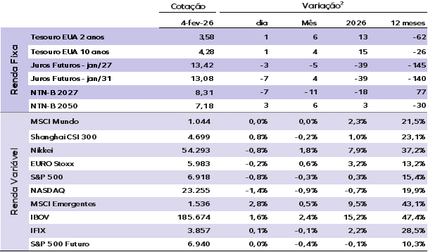 (2) Ativos de renda fixa apresentam a variação em pontos-base (p.b.), esta é a forma como o mercado expressa variações percentuais em taxas de juros e spreads. O ponto-base é igual a 0,01% ou 0,0001 em termos decimais. Os demais ativos mostram a variação em percentual.