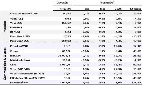 O índice DXY opera em leve alta de 0,07%, aos 97,51 pontos. O ouro avança 2,10%, cotado a US$ 5.050,63, enquanto o Bitcoin registra recuo de 0,09%, negociado a US$ 76.075,35.