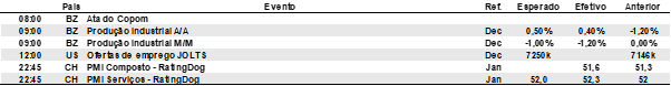 Investidores monitoram indicadores econômicos nesta semana, como o ISM de serviços de janeiro, os pedidos iniciais de auxílio-desemprego e o payroll de janeiro, além do relatório preliminar de confiança do consumidor de Michigan.
