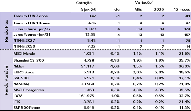 (2) Ativos de renda fixa apresentam a variação em pontos-base (p.b.), esta é a forma como o mercado expressa variações percentuais em taxas de juros e spreads. O ponto-base é igual a 0,01% ou 0,0001 em termos decimais. Os demais ativos mostram a variação em percentual.
