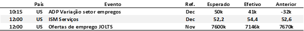 EUA: O índice ISM de serviços avançou 1,8 ponto em dezembro, para 54,4 pontos, atingindo o maior nível desde outubro de 2024 e contrariando as expectativas de leve queda. O resultado foi disseminado, com altas nos componentes de atividade, novos pedidos e emprego. Os indicadores de novos pedidos de exportação e de importações também subiram, enquanto o índice de preços pagos recuou para o menor nível desde março de 2025, sinalizando algum alívio nas pressões de custos.