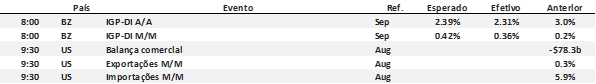 Brasil: O Índice de Preços ao Consumidor – Semanal (IPC-S) avançou 0,63% na 1ª quadrissemana de outubro, acumulando alta de 4,12% em 12 meses, segundo a FGV. Entre as oito classes de despesa que compõem o indicador, apenas uma registrou desaceleração. O grupo Habitação, principal influência sobre o índice, teve variação de 1,62%, abaixo dos 2,13% observados na última leitura, refletindo menor pressão de itens como energia elétrica e aluguel.