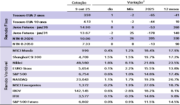 (2) Ativos de renda fixa apresentam a variação em pontos-base (p.b.), esta é a forma como o mercado expressa variações percentuais em taxas de juros e spreads. O ponto-base é igual a 0,01% ou 0,0001 em termos decimais. Os demais ativos mostram a variação em percentual.