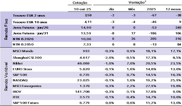 (2) Ativos de renda fixa apresentam a variação em pontos-base (p.b.), esta é a forma como o mercado expressa variações percentuais em taxas de juros e spreads. O ponto-base é igual a 0,01% ou 0,0001 em termos decimais. Os demais ativos mostram a variação em percentual.