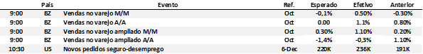 Brasil: As vendas do varejo surpreenderam positivamente em outubro. No conceito restrito, as vendas cresceram 1,1% na comparação anual, superando as projeções do mercado. O varejo ampliado recuou apenas 0,3% na mesma base, mostrando queda mais branda que o esperado. Na série com ajuste sazonal, o varejo restrito avançou 0,5% frente a setembro — melhor resultado desde março —, enquanto o varejo ampliado cresceu 1,1% e acumula quatro altas consecutivas — revertendo integralmente a queda acentuada registrada em junho.