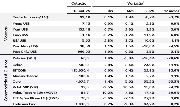 (2) Ativos de renda fixa apresentam a variação em pontos-base (p.b.), esta é a forma como o mercado expressa variações percentuais em taxas de juros e spreads. O ponto-base é igual a 0,01% ou 0,0001 em termos decimais. Os demais ativos mostram a variação em percentual.