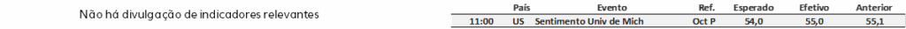 EUA: O índice de sentimento do consumidor da Universidade de Michigan recuou 0,1 ponto em outubro, para 55,0 pontos, levemente acima das expectativas. O subíndice que mede as condições econômicas atuais avançou 0,6 ponto, para 61,0 pontos, enquanto o componente de expectativas dos consumidores caiu 0,5 ponto, para 51,2 pontos. As entrevistas realizadas indicam que o atual shutdown do governo federal ainda não afetou de forma significativa a percepção sobre a economia.