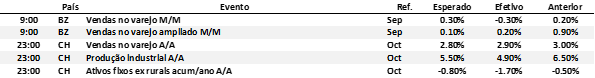 China: A atividade econômica perdeu força em outubro, com desaceleração significativa na produção industrial e nos investimentos. A produção industrial cresceu 4,9% em relação ao ano anterior, abaixo do ritmo de setembro, refletindo exportações mais fracas e quedas expressivas em setores como computadores, máquinas elétricas e produtos farmacêuticos — embora a geração de energia tenha acelerado.