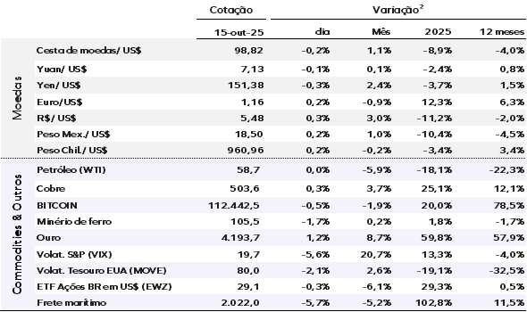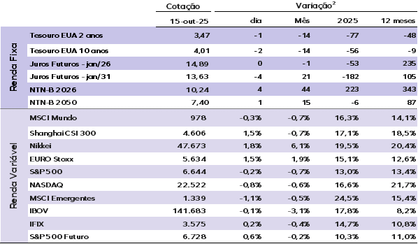 (2) Ativos de renda fixa apresentam a variação em pontos-base (p.b.), esta é a forma como o mercado expressa variações percentuais em taxas de juros e spreads. O ponto-base é igual a 0,01% ou 0,0001 em termos decimais. Os demais ativos mostram a variação em percentual.