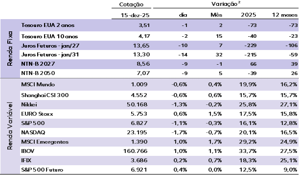 (2) Ativos de renda fixa apresentam a variação em pontos-base (p.b.), esta é a forma como o mercado expressa variações percentuais em taxas de juros e spreads. O ponto-base é igual a 0,01% ou 0,0001 em termos decimais. Os demais ativos mostram a variação em percentual.