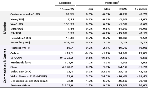 O índice do dólar (DXY), medido pela cesta de moedas, está estável em 99,60 pontos. O ouro negocia a US$ 4.043,00 por onça. No mercado de criptoativos, a bitcoin perde 0,60%, cotada a US$ 91.303,20.