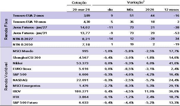 (2) Ativos de renda fixa apresentam a variação em pontos-base (p.b.), esta é a forma como o mercado expressa variações percentuais em taxas de juros e spreads. O ponto-base é igual a 0,01% ou 0,0001 em termos decimais. Os demais ativos mostram a variação em percentual.
