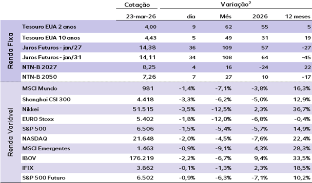 (2) Ativos de renda fixa apresentam a variação em pontos-base (p.b.), esta é a forma como o mercado expressa variações percentuais em taxas de juros e spreads. O ponto-base é igual a 0,01% ou 0,0001 em termos decimais. Os demais ativos mostram a variação em percentual.