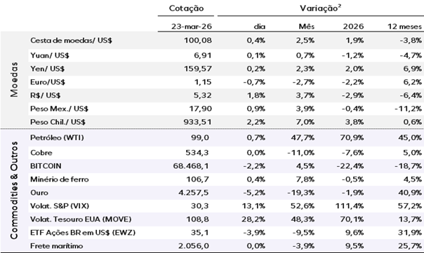 No mercado de moedas, o índice DXY avança 0,44%, aos 100,08 pontos. O ouro, por sua vez, segue a tendência recente de liquidação e registra forte queda, enquanto os investidores continuam a se afastar dos metais preciosos como porto seguro em meio à guerra em andamento no Irã. O metal recua 5,23%, negociado a US$ 4.257,48 por onça-troy. O Bitcoin opera em baixa de 2,25%, cotado a US$ 68.468,10.