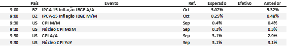 Previsto originalmente para o dia 15 de outubro, o indicador será o último dado econômico antes da reunião do Federal Reserve marcada para a próxima semana. Economistas projetam alta de 0,40% nos preços ao consumidor em setembro, repetindo o ritmo do mês anterior. Com isso, a inflação acumulada em 12 meses deve atingir 3,10% — 0,20 ponto percentual acima do registrado em agosto. O núcleo do índice, que exclui alimentos e energia, deve subir 0,30% no mês e 3,10% em 12 meses, mantendo os mesmos níveis do mês anterior.