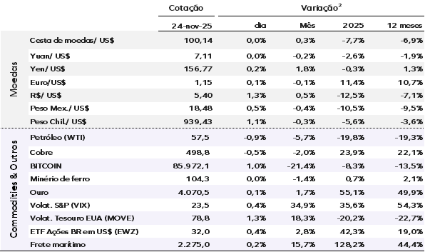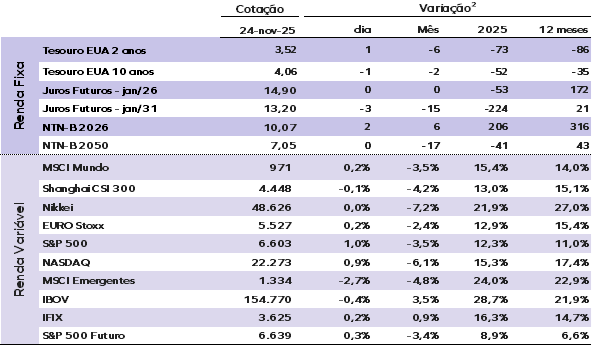 Os mercados globais seguem voláteis. Investidores reavaliam as ações das big techs e empresas ligadas à inteligência artificial. A volatilidade diminuiu desde sexta-feira (21), mas o apetite por risco permanece contido.