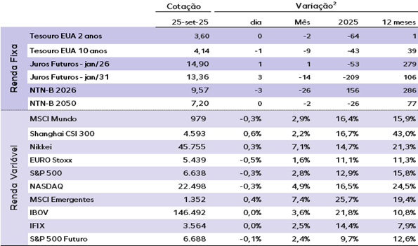 Brasil: Na ONU, Trump fez aceno a Lula, sinalizando uma distensão e abrindo a porta para negociar. Ainda que seja algo positivo, dado o caráter errático dos personagens envolvidos, é preciso esperar algo concreto para ter uma conclusão.