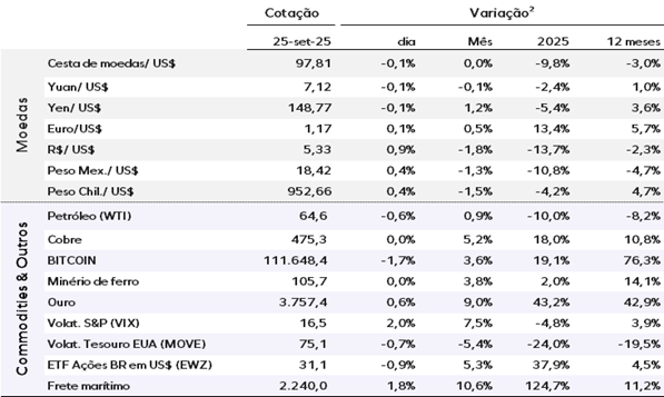 O índice do dólar americano (DXY) recua 0,10%, cotado a 97,80 pontos. O ouro à vista mantém estabilidade, negociado a US$ 3.734,04 por onça. O petróleo opera em leve baixa, com o Brent recuando US$ 0,18, ou 0,26%, para US$ 69,13 o barril.