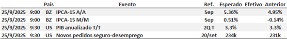 Também hoje (25) às 9h30, o Departamento do Trabalho dos EUA publica os dados semanais de emprego. O presidente do Fed, Jerome Powell, afirmou que a desaceleração do mercado de trabalho tem superado as preocupações com a inflação, o que pavimentou a decisão recente de cortar os juros pela primeira vez em 2025. Powell destacou “uma desaceleração marcante” na dinâmica de oferta e demanda e observou que, em um mercado de trabalho menos dinâmico e mais brando, os riscos negativos para o emprego aumentaram.