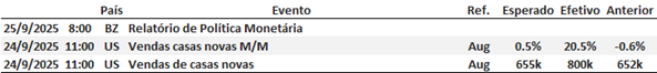 EUA: Vendas de novas residências surpreenderam em agosto com forte alta, de 20,5% em relação ao mês anterior, e revertem a queda de 1,8% observada em julho. Esse desempenho surpreendeu analistas, que esperavam um aumento modesto de 0,2%, impulsionado pela leve moderação nas taxas de financiamento imobiliário. Foi o melhor mês desde o fim de 2021.