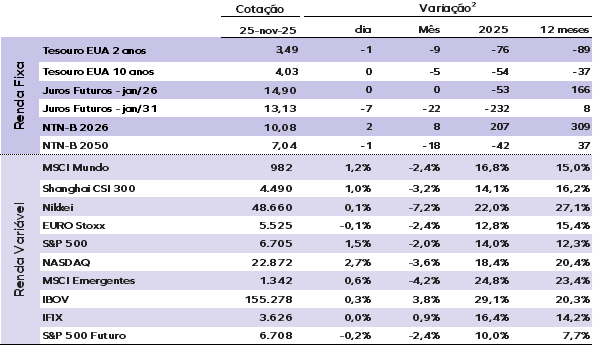 Os mercados globais seguem voláteis, oscilando entre as dúvidas sobre o valor justo da IA e das big techs e a esperança de um corte de juros nos Estados Unidos em dezembro.