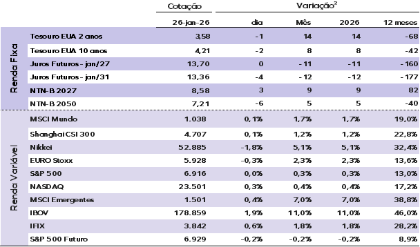 (2) Ativos de renda fixa apresentam a variação em pontos-base (p.b.), esta é a forma como o mercado expressa variações percentuais em taxas de juros e spreads. O ponto-base é igual a 0,01% ou 0,0001 em termos decimais. Os demais ativos mostram a variação em percentual.