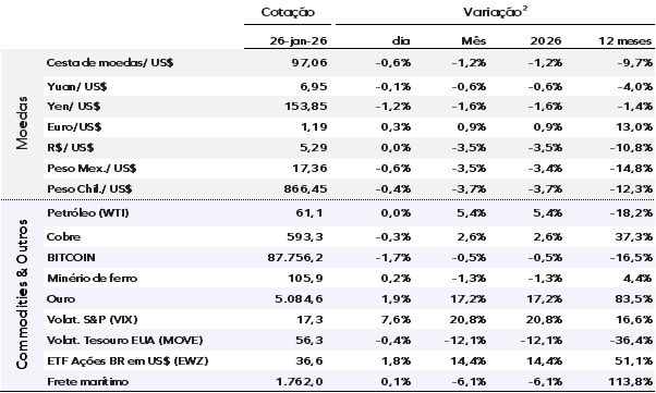 O quadro de incerteza geopolítica impulsiona o ouro, que superou a marca de US$ 5.100 por onça-troy no mercado à vista pela primeira vez. Enquanto isso, os ativos de risco operam em leve baixa.