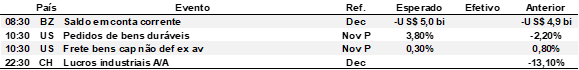 EUA: O índice PMI de serviços permaneceu estável em 52,5 pontos em janeiro, levemente abaixo das expectativas do mercado. Apesar da estabilidade do indicador cheio, a composição foi relativamente favorável, com avanço dos novos negócios e do emprego. Ao mesmo tempo, as pressões de custos arrefeceram: os preços dos insumos recuaram ao menor nível desde abril de 2025 e os preços cobrados pelos serviços também mostraram desaceleração, embora o indicador de atividade futura tenha apresentado leve queda.