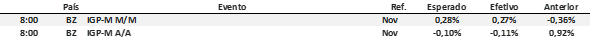 Brasil: O IGP-M avançou 0,27% em novembro, após cair 0,36% em outubro, ficando levemente abaixo das projeções do mercado. A alta foi impulsionada principalmente pelo IPA, que reverteu a deflação do mês anterior tanto no segmento agropecuário — apoiado por aumentos em soja, bovinos e leite in natura — quanto no industrial — onde bens industriais subiram 0,21%, com destaque para minerais metálicos, alimentos e produtos químicos.