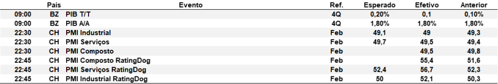China – O PMI industrial recuou em fevereiro, refletindo os efeitos do Ano Novo Lunar sobre a atividade. O PMI da indústria caiu para 49,0 pontos, abaixo do consenso, com retração nos subíndices de produção, novos pedidos e emprego. O órgão atribuiu o enfraquecimento ao feriado concentrado em fevereiro, que interrompeu operações e reduziu a atividade de mercado. Ainda assim, alguns segmentos — como processamento de alimentos e equipamentos eletrônicos — seguiram crescendo, enquanto vestuário e automóveis perderam fôlego.