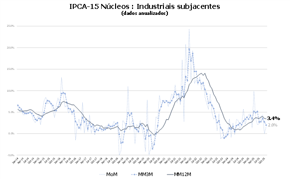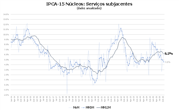 Em termos anuais, o núcleo de serviços seguiu desacelerando. A média móvel trimestral anualizada recuou para 4,6% em novembro, após permanecer 12 meses consecutivos acima de 5,0%.