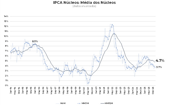 Em novembro, os núcleos registraram alta de 0,23%, abaixo do patamar de 0,26% de outubro. No acumulado de 12 meses, a alta desacelerou de 4,9% para 4,7%, reforçando a tendência de desaceleração. A média móvel trimestral anualizada também desacelerou: de 3,9% em outubro para 3,7% em novembro.