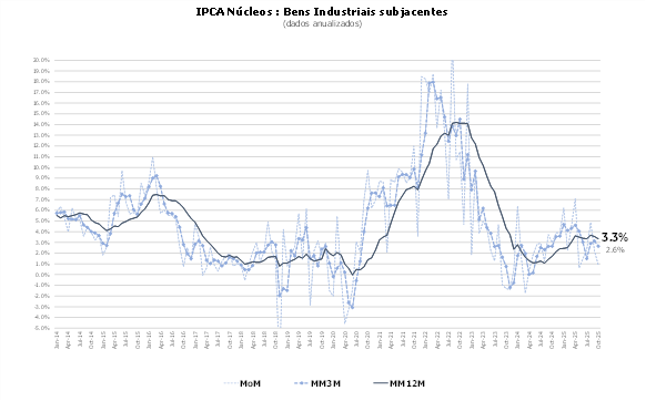A leitura de outubro mostrou nova desaceleração dos núcleos e dos preços de bens e serviços. Os alimentos voltaram a surpreender com queda de preços, acompanhados por deflações em eletroeletrônicos, seguro de veículos e no grupo comunicação. A tendência de desinflação dos últimos meses se consolidou, reforçando a confiança no retorno da inflação à meta.